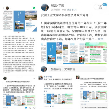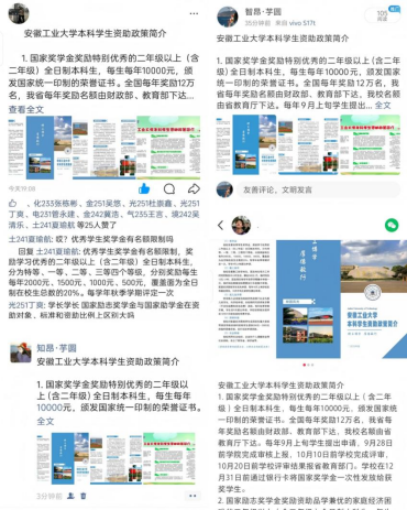 为适应新时代宣传趋势,拓宽政策传播渠道,宣传大使们充分利用新媒体平台的传播优势,在QQ、微信、微博、抖音、小红书等平台发布资助政策解读文章、图文海报、短视频等内容,构建“多平台联动、全方位覆盖”的宣传矩阵。在微信端,制作图文并茂的政策解读长图,将国家奖学金、助学贷款等核心政策拆解为易懂知识点,方便快速查阅;在QQ空间发布政策简介长文、解读海报,针对同学咨询的“勤工俭学报名”“学费减免”“申请时间”等问题,在评论区逐一细致回复,一对一解决疑惑;在微博发起#安工大资助知多少#话题,发布政策短视频和图文,联动官方账号扩散,提升政策知晓度,形成了“线上线下互补、传统新兴结合”的宣传格局,让资助政策突破时间和空间的限制,触达更多学子。