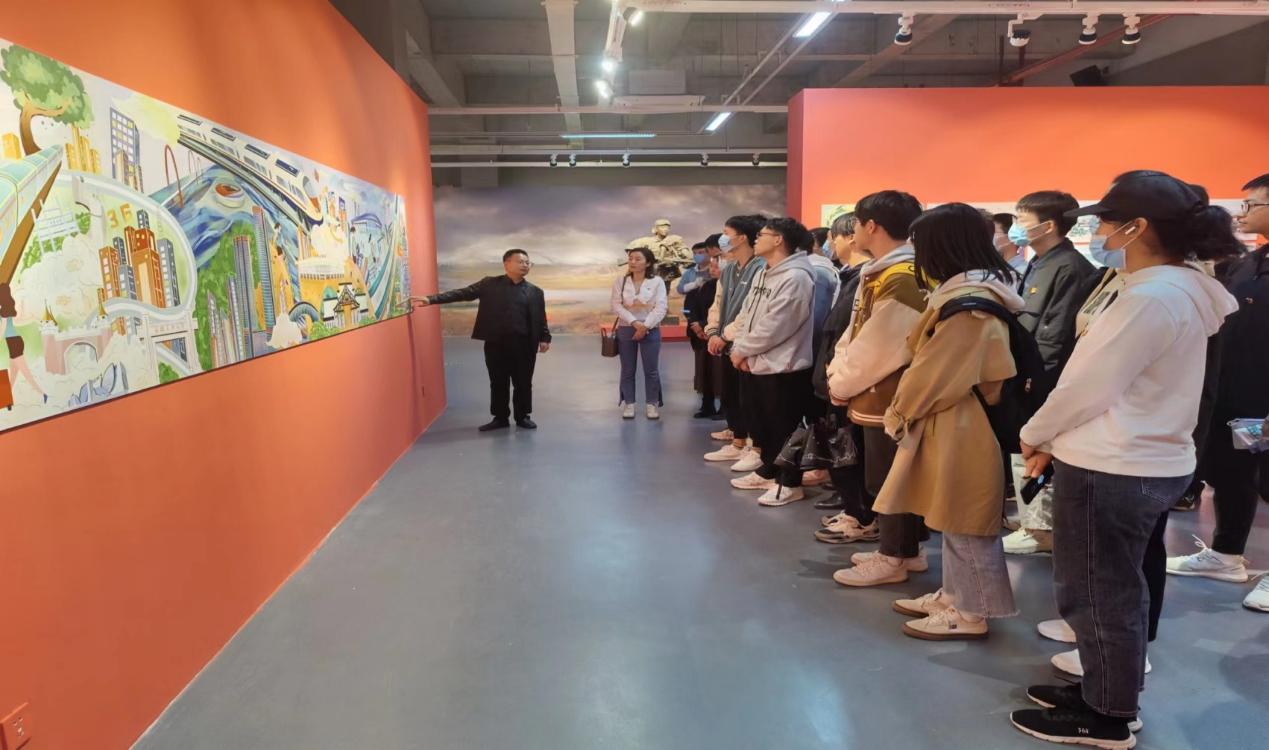 汪正为同学们讲解每一件作品的来源,其中一幅缤纷多彩的长画卷吸引了同学们的注意。汪正介绍这幅图的创作思路来源于马鞍山加入长三角一体化的发展战略,向我们展示了马鞍山的蓬勃发展劲头,通过画卷,支部党员了解到当下长三角首个铁水联运工程——郑蒲港铁路、巢马城际、宁马城际、宁马高速“四改八”、宁和高速等大通道全线开工,毗邻城市的产业正在一体互融,实现地区突破,也使马鞍山与长三角城市的距离前所未有的拉近。除此之外,学生党员还观看了关于助力马鞍山乡村振兴的相关文化产品、社会主义核心价值观宣传作品、以及以党史故事为题材而设计的雕塑作品。这里的每一件文化作品、每一个创意设计都在用以笔传情,以画传志的方式,介绍着马鞍山的历史与人文,抒发着对党和祖国的热爱,表达出我校师生对迎接党的二十大胜利召开的喜悦之情。