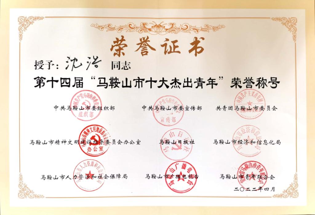 沈浩教授荣获第十四届“马鞍山市十大杰出青年”殊荣。