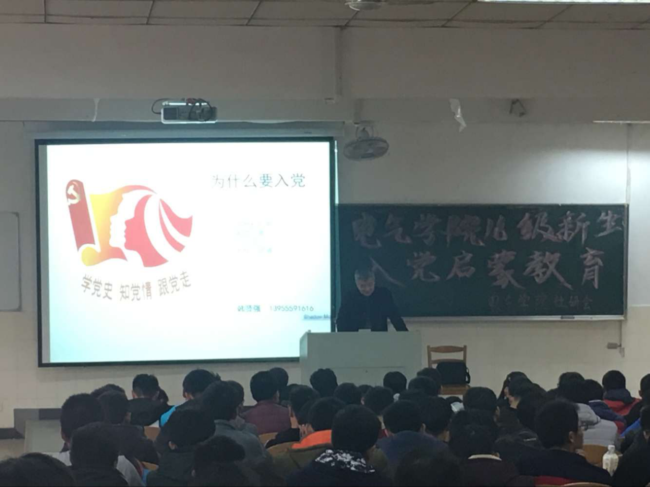 韩贤强老师以《红旗谱》中朱老忠的口头禅“出水才看两腿泥”开场,从理想和追求、希望在青年、入党为什么、怎样写申请等方面出发,向同学们讲解了党的性质、宗旨、原则及党领导中国人民所取得的伟大成就,着重讲述了树立正确入党动机的重要性,详实介绍了大学生发展党员的具体标准,明确讲解了入党程序以及入党应履行的手续等。他向同学们提出四点要求:一是努力学习,打牢专业知识基础和科学文化知识基础,做一个有知识有文化的大学生;二是文明修身,养成良好习惯,做一个有良好素质的大学生;三是积极实践,勇于锻炼,做一个有能力的大学生;四是持之以恒,磨练意志、培养毅力,做一个有成就的大学生。最后,他希望同学们大学期间严格要求自己,踊跃递交入党申请书,尽快从思想上、行动上向党组织靠拢,争取早日成为一名光荣的中国共产党党员。