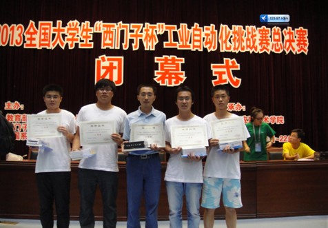 由教育部、中国系统仿真学会和西门子(中国)有限公司联合主办的2013年全国大学生自动化挑战赛总决赛于8月18日至8月22日在上海举行。本次比赛共有来自全国各地75所高校的104支代表队,320多名师生参赛,是历届比赛参赛人数最多、赛程最长、难度最大、系统性最完整、水平最高、竞争最激烈的一次比赛。我校的两支队伍(设计开发组:熊少康、马冬冬;工程应用组:郭许林、翟吉庆)在冯旭刚、胡雪峰等教师团队的精心指导下,通过方案设计、竞标实施、排错优化、现场测试、工程移交和专家答辩多个环节,凭借充分的准备和稳健的发挥,最终夺得设计开发和工程应用组两项特等奖,为学校赢得了荣誉。分别有8所高校获得设计开发组和工程应用竞赛组特等奖。