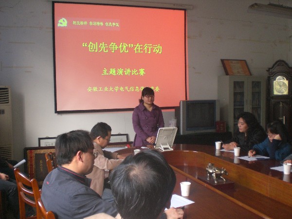 基层支部的6位党员教师参加。他们按照比赛的要求,紧紧围绕创先争优活动,有的抒发示范岗创建过程中的所感所得,有的激情颂扬身边的优秀党员,有的展示所在支部创先争优活动中的精彩片段,朴实的文字,真切的情感,深沉的思考打动了在场的每一位党员。经过激烈的角逐,来自学生第一支部的李冉老师获得了第一名。