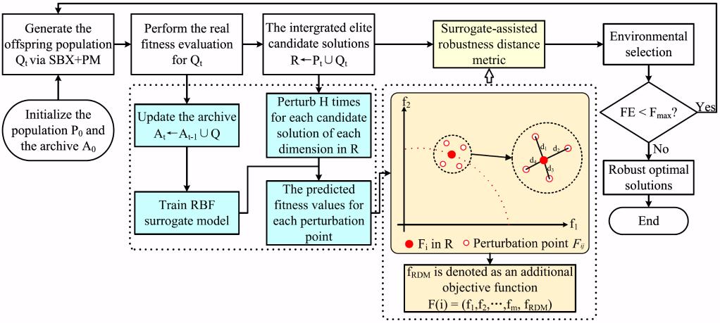 针对鲁棒多目标优化问题求解过程中计算成本高的难题,团队提出了代理模型辅助的鲁棒多目标进化算法。通过引入RBF代理模型预测扰动邻域内采样点适应度值,根据代理模型预测邻域内采样点目标值与候选解目标值之间的欧氏距离之和,设计了鲁棒距离度量指标,将鲁棒多目标优化问题转化为高维多目标优化问题进行求解,综合权衡算法的最优性与鲁棒性。实验结果表明,所提算法在收敛性、分布性与鲁棒性上均优于对比算法,验证了算法的效率和效果。研究成果发表在《IEEE Transactions on Cybernetics》(IF:10.5,Top期刊)。我校为论文第一完成单位,李飞副教授为论文第一作者,西湖大学金耀初教授为论文通讯作者。