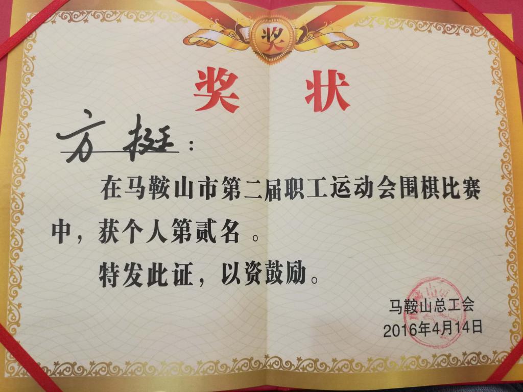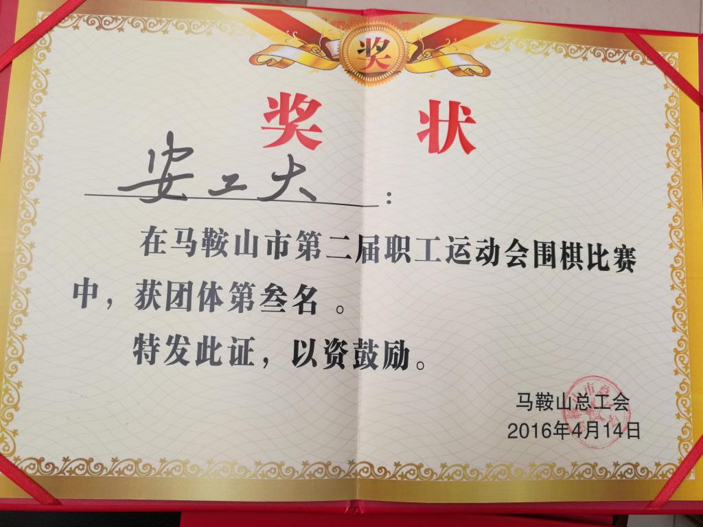 马鞍山市第二届职工运动会围棋比赛证书