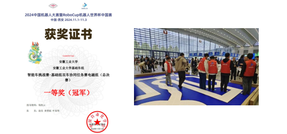 11月1日,以“硬科技·新质生产力”为主题的2024中国机器人大赛暨RoboCup机器人世界杯中国赛全国总决赛在西安盛大开幕,吸引了来自全国300余所高校超过3000名选手齐聚一堂,展开了一场高水平的较量。我院电气工程及其自动化专业23级赵亮,测控技术与仪器23级黄曌韬,以及微数学院的微电子专业23级叶家明组成的参赛队(指导教师:钱牧云)凭借出色的技术实力和密切的团队协作,在基础组双车协同任务赛电磁组别中勇夺全国冠军。