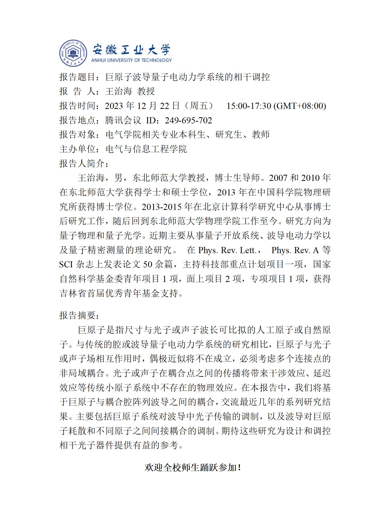 “谦之”学术讲坛之六十四-巨原子波导量子电动力学系统的相干调控