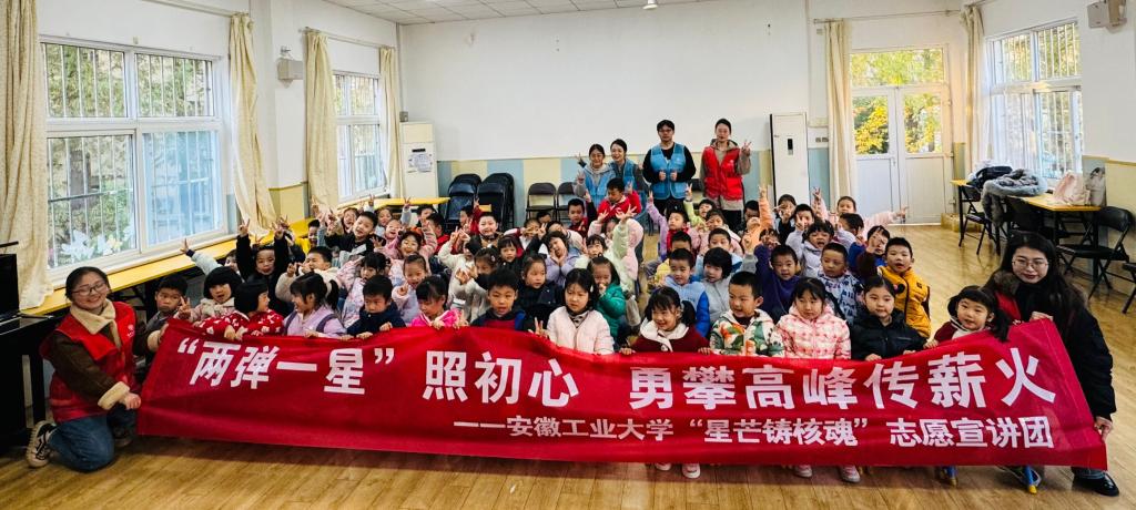 11月21日下午,我院8名师生党员、发展对象、入党积极分子走进安工大幼儿园的多媒体报告厅,面向所有大班幼儿开展“听科学家故事,传‘两弹一星’精神”主题宣讲活动。志愿者们以童趣化的动画、视频短片为载体,结合互动提问,为近70名幼儿讲述钱学森、邓稼先等科学家的感人事迹及新中国“两弹一星”事业的发展历程。