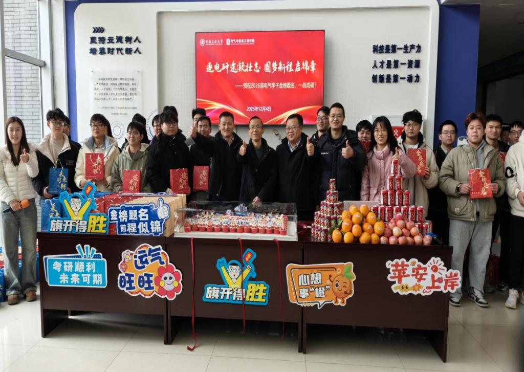 为鼓舞考研学子士气,缓解备考压力,12月4日下午,学院开展“逐电研途凝壮志 圆梦新程启锦章”考研送温暖活动。学院党委书记丁忠利、副院长(主持工作)程木田、党委副书记、纪委书记、副院长孔洋波以及毕业班辅导员参加活动,为正在全力备考的考研学子送上关怀与诚挚祝福。