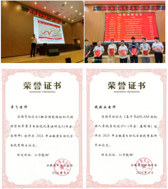 会上,专家们对各高校推荐的硕士论文和本科毕业设计(论文)进行了评选,我院硕士研究生尚郑坤撰写的论文《融合性能指标和代理模型的昂贵多目标优化算法研究》(指导老师:李飞)和本科生康彬燕撰写的毕业论文《基于RatSLAM的机器人导航系统设计》(指导老师:钱牧云)分别获得安徽省自动化学会优秀硕士论文奖和本科毕业论文奖。