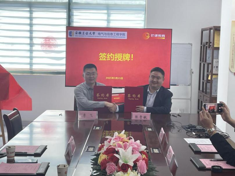 3月25日,学院副院长李飞一行前往安徽芒课教育科技有限公司开展实践教学基地签约暨揭牌仪式。安徽芒课研究院常务副院长张贵敏、青软晶芒副总经理陶羽及各部门负责人出席,学院自动化系副主任费习宏、电子与通信系副主任王康参加签约和授牌对接活动。