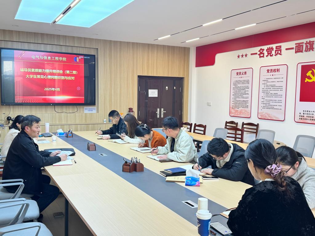 为进一步加强辅导员队伍建设,提升辅导员对学生心理问题的识别与应对能力,4月2日,电气与信息工程学院举办第二期辅导员素质能力提升培训会,本次培训以“大学生常见心理问题识别与应对”为主题,培训会由学院心理工作站站长从婉露主持,特邀校心理中心杜小英老师主讲,学院全体辅导员参加。