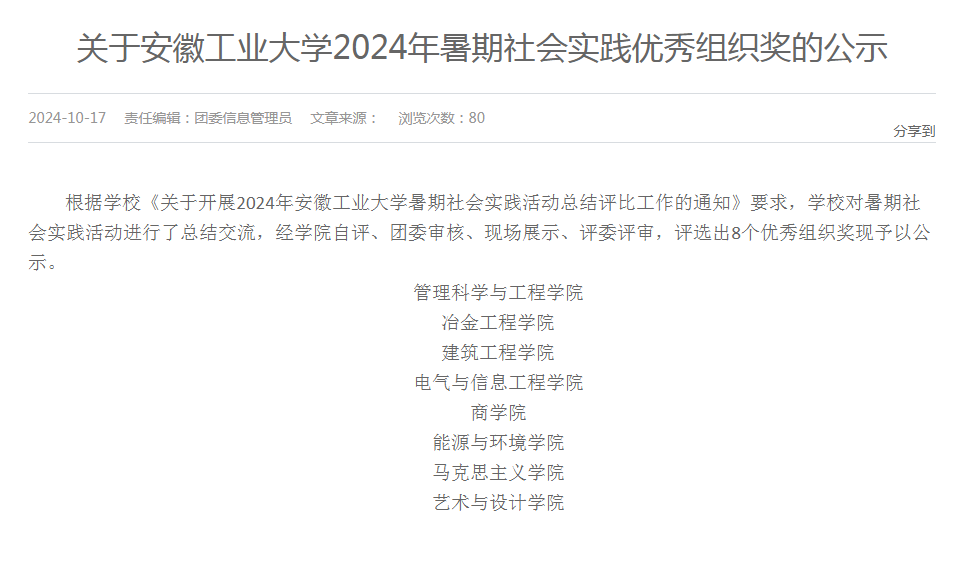 近日,学校根据《关于开展2024年安徽工业大学暑期社会实践活动总结评比工作的通知》要求,学校对暑期社会实践活动进行了严格考核,凭借优秀的组织工作以及显著的实践成果,我院荣获安徽工业大学2024年暑期社会实践优秀组织奖。