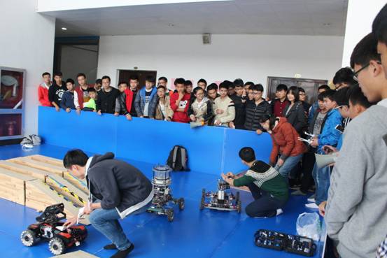 展览一开始便吸引了一大批学生前来观摩。本次展示分为两个场景,首先是在113室播放竞赛集锦视频,包括各类机器人、智能车比赛中的精彩瞬间以及高难度特效片段,在场同学惊叹声连连。其次是现场讲解与展示。所展出的科技创新作品均在各级各类竞赛中获奖。设计精巧的智能车在黑白相间的赛道飞速行驶,舞蹈机器人在音乐声中展示着连贯动人的舞姿,旅游机器人在指令下“翻山越岭”,无人机巧妙灵活的完成指定任务。很多同学都由衷地发出感慨,觉得“牛人就在身边”。