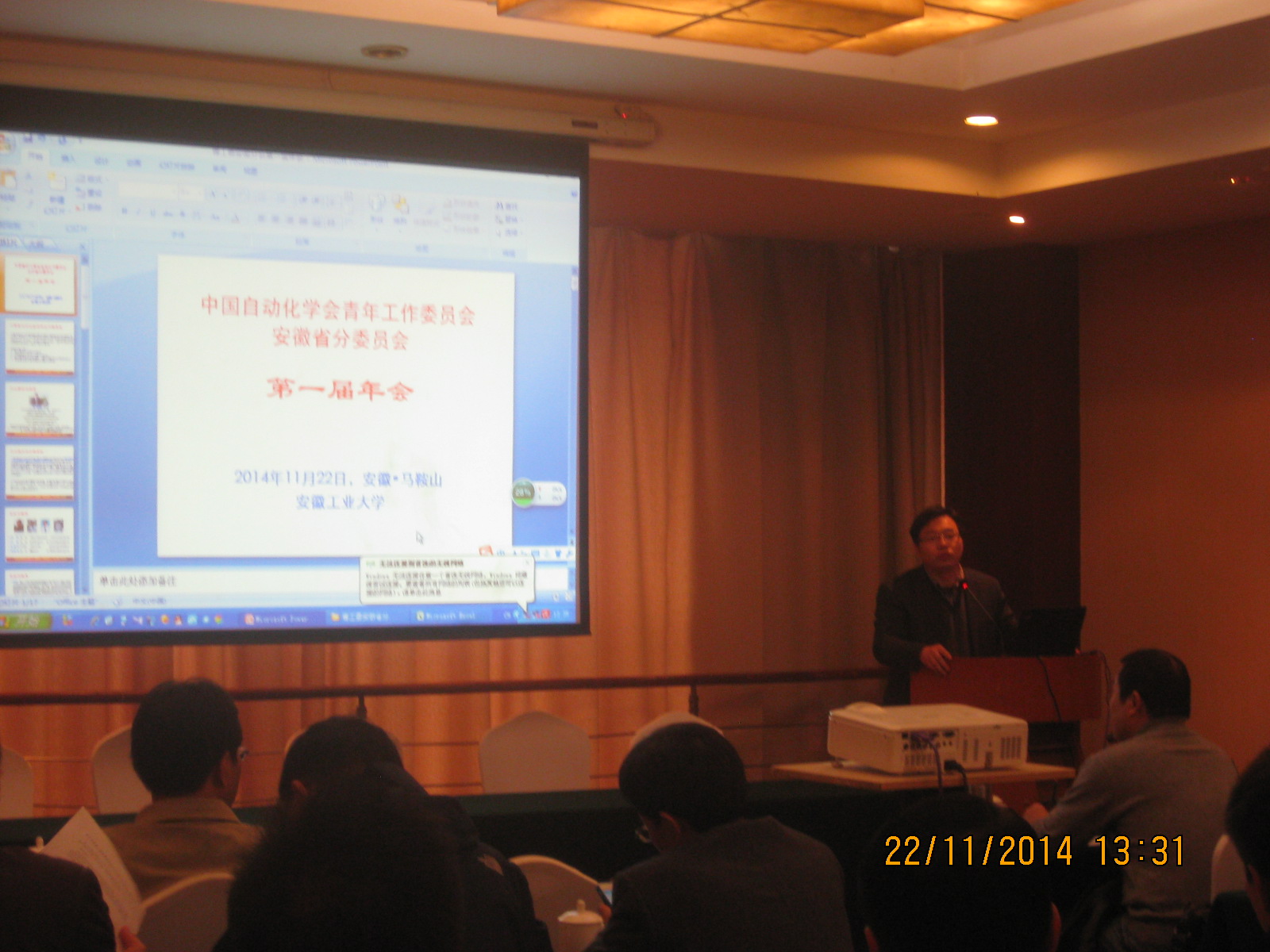 孙长银教授在致辞中介绍了中国自动化学会青年工作委员会的组织、章程等相关情况,以及青年工作委员会在从事自动化领域研究的青年学者之间的交流与合作方面所起的作用,并向中国自动化学会青工委安徽省分委员会的成立表示了祝贺,预祝“中国自动化学会青工委安徽省分委员会第一届年会”圆满举行。康宇教授首先向参会代表介绍了中国自动化学会青工委安徽省分委员会的组织架构,介绍了康宇教授、唐昊教授、何舒平教授和孙丙宇教授4位副主任委员的相关情况,以及省内各高校的委员、会员的基本情况。我校自动化系的沈浩博士当选为委员,方炜、孔庆凯、姚凤麒、李丹4位老师当选为会员。