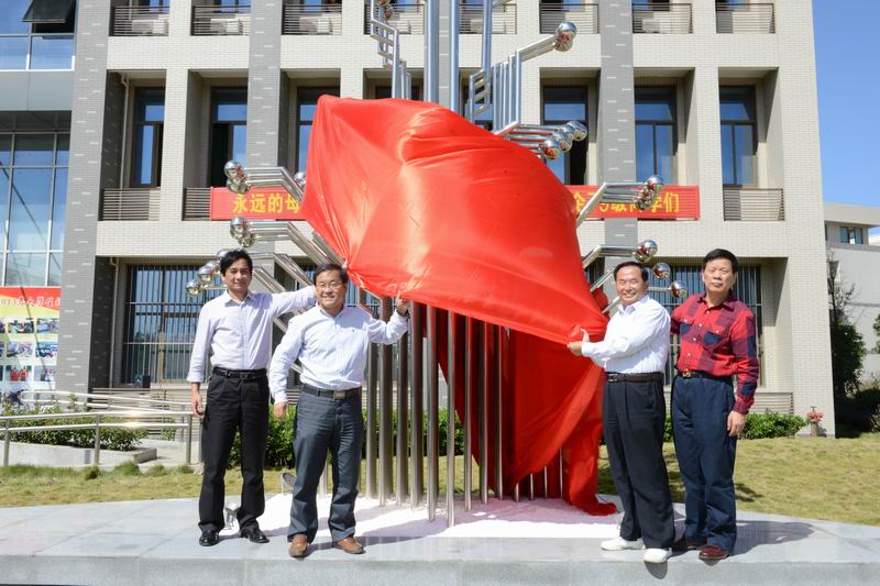 工企83届校友向母校捐赠雕塑揭幕仪式在秀山校区电气楼门前广场举行。安工大副校长陈润、葛芦生,马鞍山市人大原秘书长王兴无,安工大校友工作处处长陈希林、副处长单桂峰,雕塑设计单位安工大艺术与设计海角社区