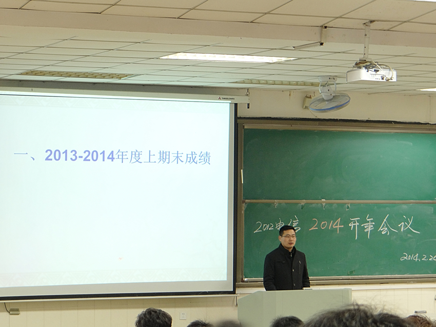 2012级电子、电气、通信三个专业在阶教104召开2014年开年会议。尚全主持了会议,七个班的260名同学参会。