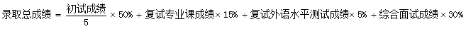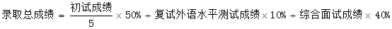 三、考生实行差额复试,总成绩中初试成绩与复试成绩将按照以下公式比例进行计算。具体录取总成绩由以下公式进行计算,其中的复试专业课成绩,复试外语水平测试成绩,综合面试成绩都按照百分制计算。