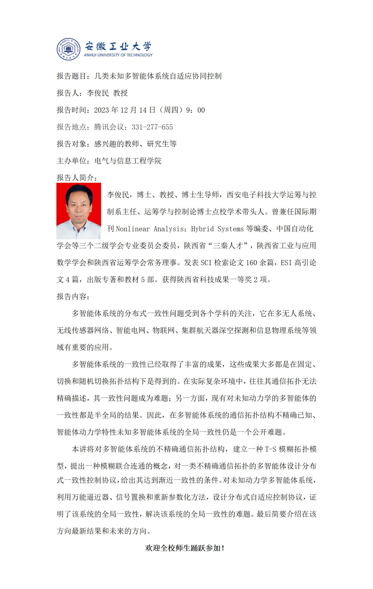 “谦之”学术讲坛之六十一-几类未知多智能体系统自适应协同控制