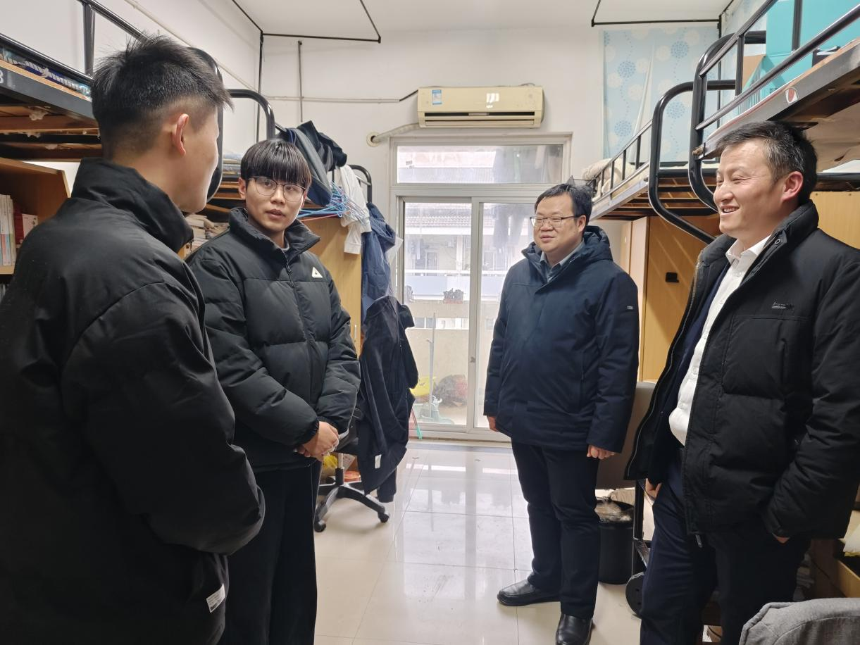 冬日暖阳映校园,岁末关怀暖人心。在2026年元旦佳节来临之际,为深入了解我院学生学习生活情况,强化学生安全意识,增进师生情感交流,12月31日下午,院副院长(主持工作)程木田、院党委副书记、纪委书记、副院长孔洋波带领全体辅导员,深入学生宿舍开展走访慰问活动。