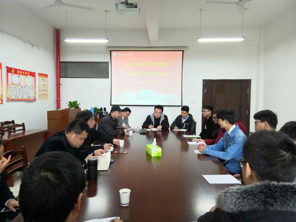 为落实学院党建品牌创建活动,进一步做好教学管理和学风建设工作,3月11日下午,电气与信息工程学院在电气楼304举办了专业课学习师生座谈会。学院党委副书记、副院长郭宏,电工电子支部全体老师及2017级辅导员、学生代表参加了座谈会。
